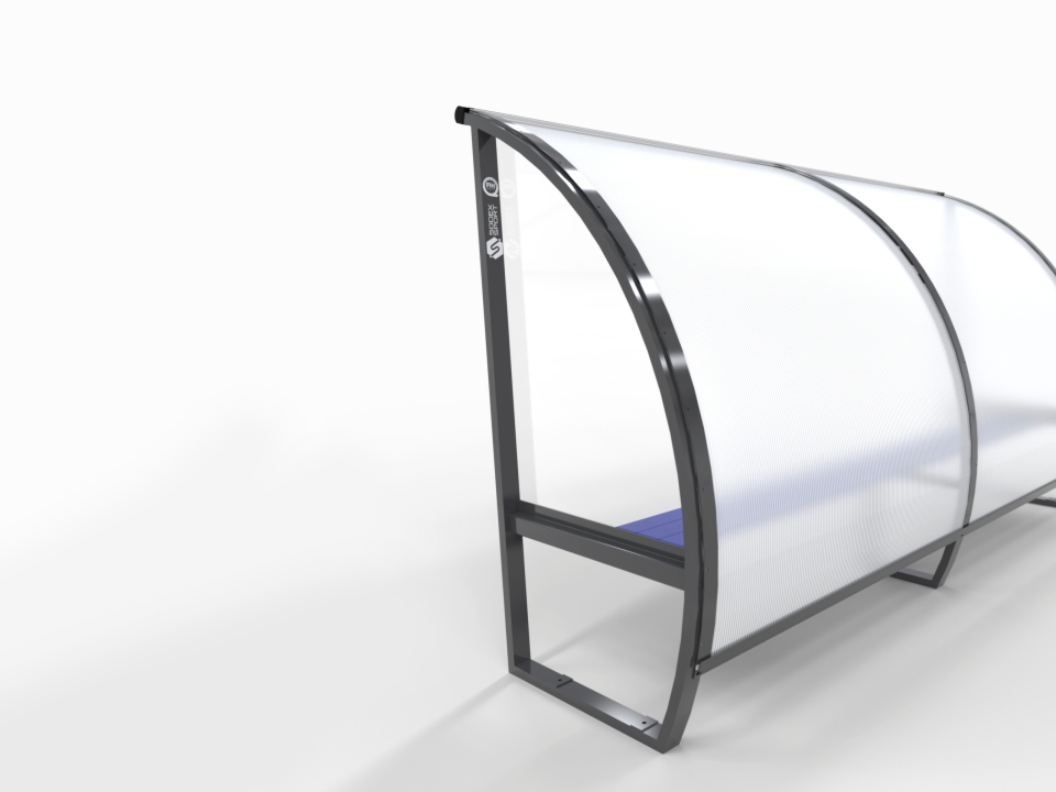 Khung ghế và thanh ngồi bằng nhôm. Tấm lợp polycarbonate. Giao kèm bộ định vị nền