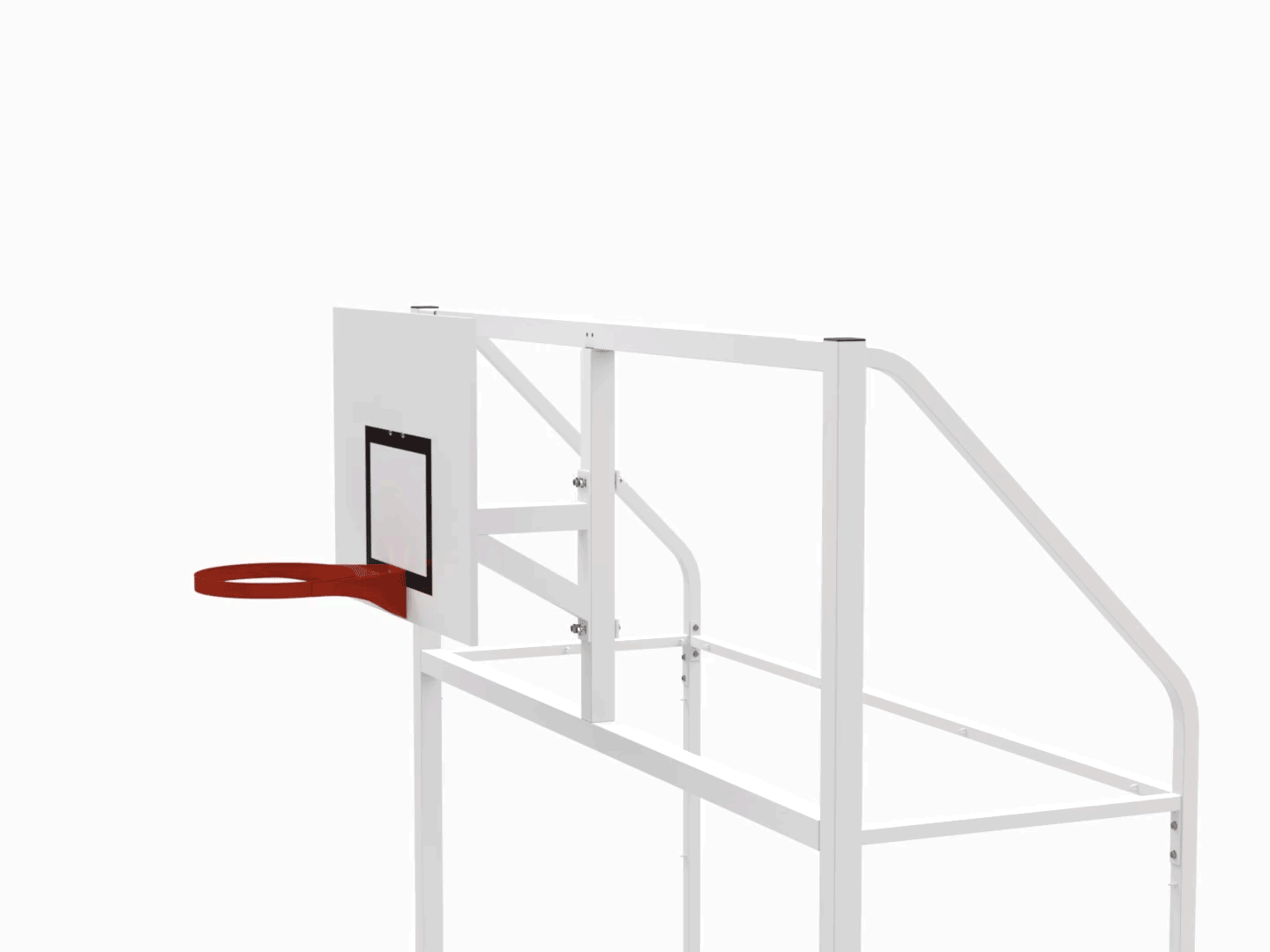 - Phần trên khung thành có cụm bảng rổ, chiều cao điều chỉnh: 2.60m hoặc 3.05m.
