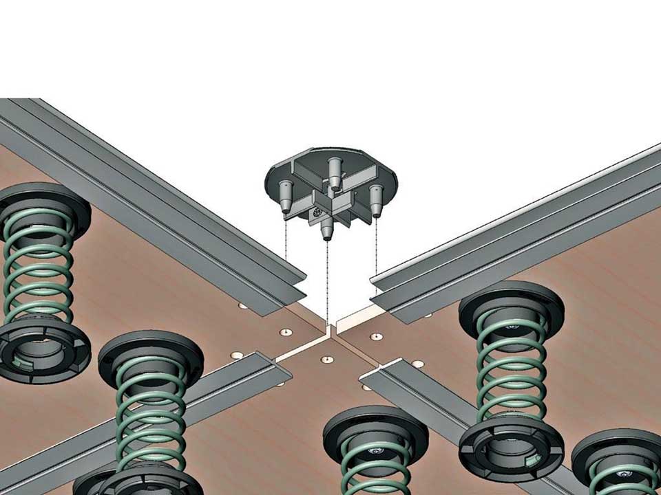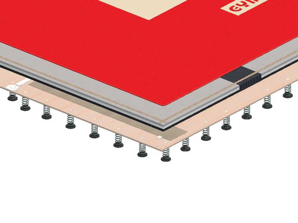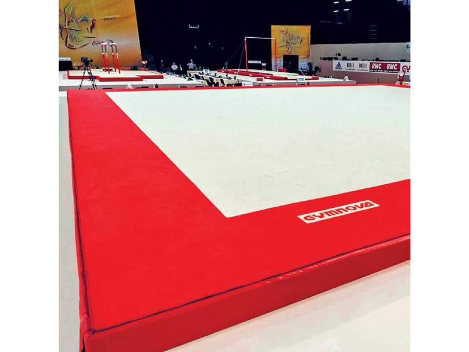 Sàn thi đấu thể dục tự do với thảm phủ. Diện tích sàn 14x14m, khu vực giới hạn 12x12m. Độ dày: 20cm