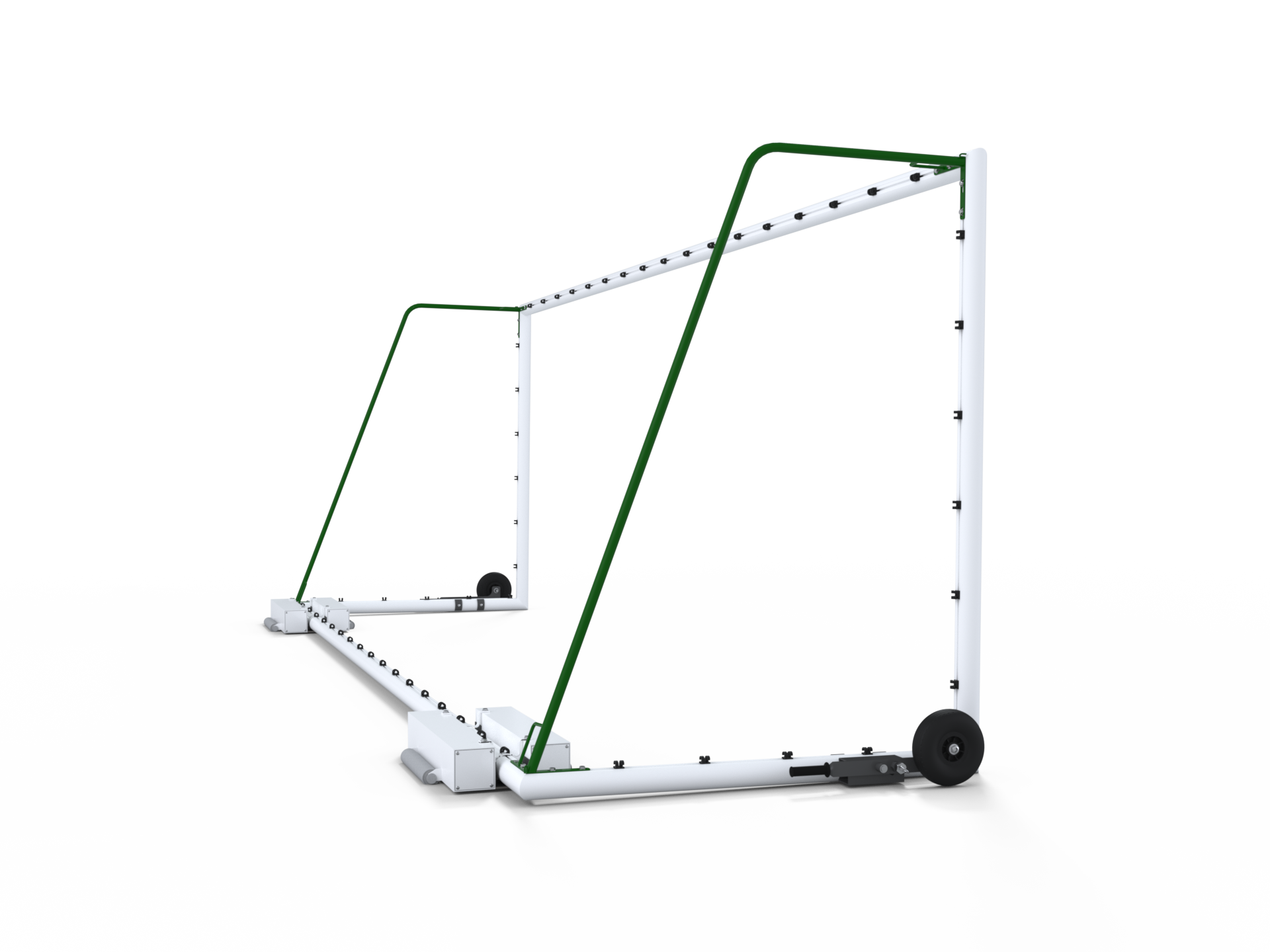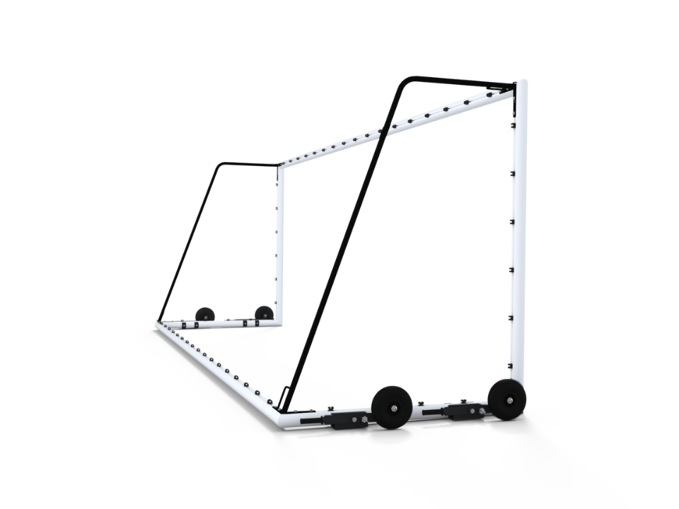 Bộ dụng cụ này bao gồm một cặp bánh xe, được gắn chặt vào các khung thành bóng đá di động để cải thiện khả năng di chuyển.