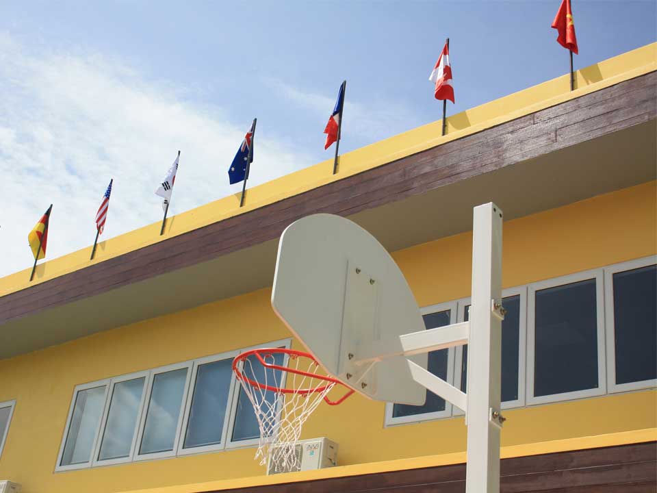 - Tầm vươn 0.60m, chiều cao vành rổ có thể điều chỉnh ở mức 2.60m hoặc 3.05m